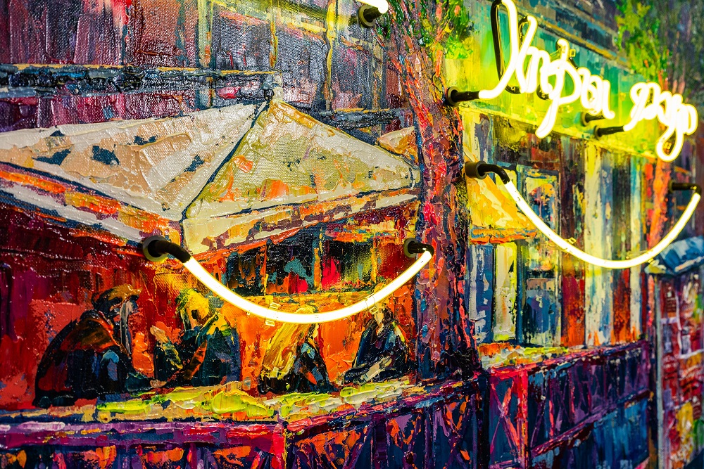 В своих работах комбинирует живопись мастихином на холсте с неоновыми, стеклянными